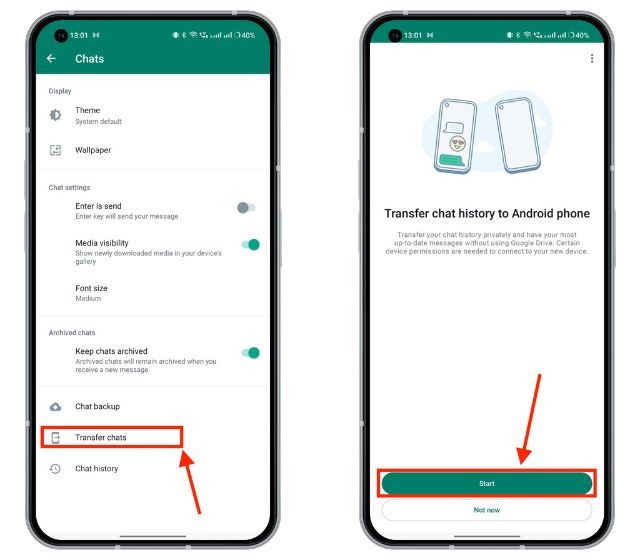 3. Then, tap the choice to Transfer Chats. Now you’ll see the welcome screen, which has a Start button you need to tap.