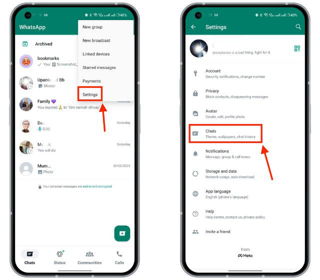 2. Find the drop-down menu and tap the Settings option. Then tap the Chats option.